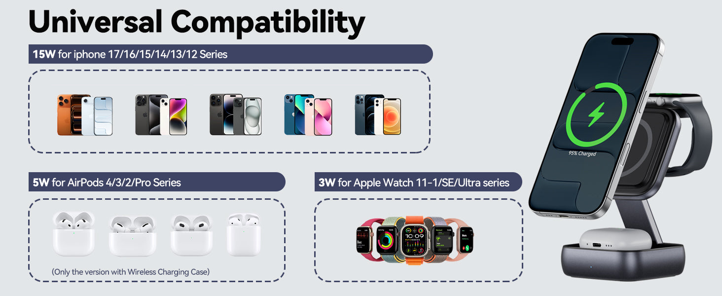 | Compatible Devices | 【For iPhone】: iPhone 17/ Air/17 Pro/17 Pro Max/iPhone 16 / 16 Plus / 16 Pro / 16 Pro Max / iPhone 15 / 15 Plus / 15 Pro / 15 Pro Max / iPhone 14 / 14 Plus / 14 Pro / 14 Pro Max / iPhone 13 / 13 mini / 13 Pro / 13 Pro Max / iPhone 12 / 12 mini / 12 Pro / 12 Pro MaxiPhone 16 / 16 Plus / 16 Pro / 16 Pro Max / iPhone 15 / 15 Plus / 15 Pro / 15 Pro Max / iPhone 14 / 14 Plus / 14 Pro / 14 Pro Max / iPhone 13 / 13 mini / 13 Pro / 13 Pro Max / iPhone 12 / 12 mini / 12 Pro / 12 Pro Max,【For Apple Watch】: for iWatch S11/S10/9/ 8 / 7 / 6 / 5 / 4 / 3 / 2 / SE / Ultra 3 2(Note: Only for Apple Watch, not for Samsung or other Watch); 【For Airpods】: AirPods 2 / 3 / 4 / Pro / Pro 3 2 (Note: Airpods 2/3 require wireless charging case)【For iPhone】: iPhone 17/ Air/17 Pro/17 Pro Max/iPhone 16 / 16 Plus / 16 Pro / 16 Pro Max / iPhone 15 / 15 Plus / 15 Pro / 15 Pro Max / iPhone 14 / 14 Plus / 14 Pro / 14 Pro Max / iPhone 13 / 13 mini / 13 Pro / 13 Pro Max / iPho… See more |