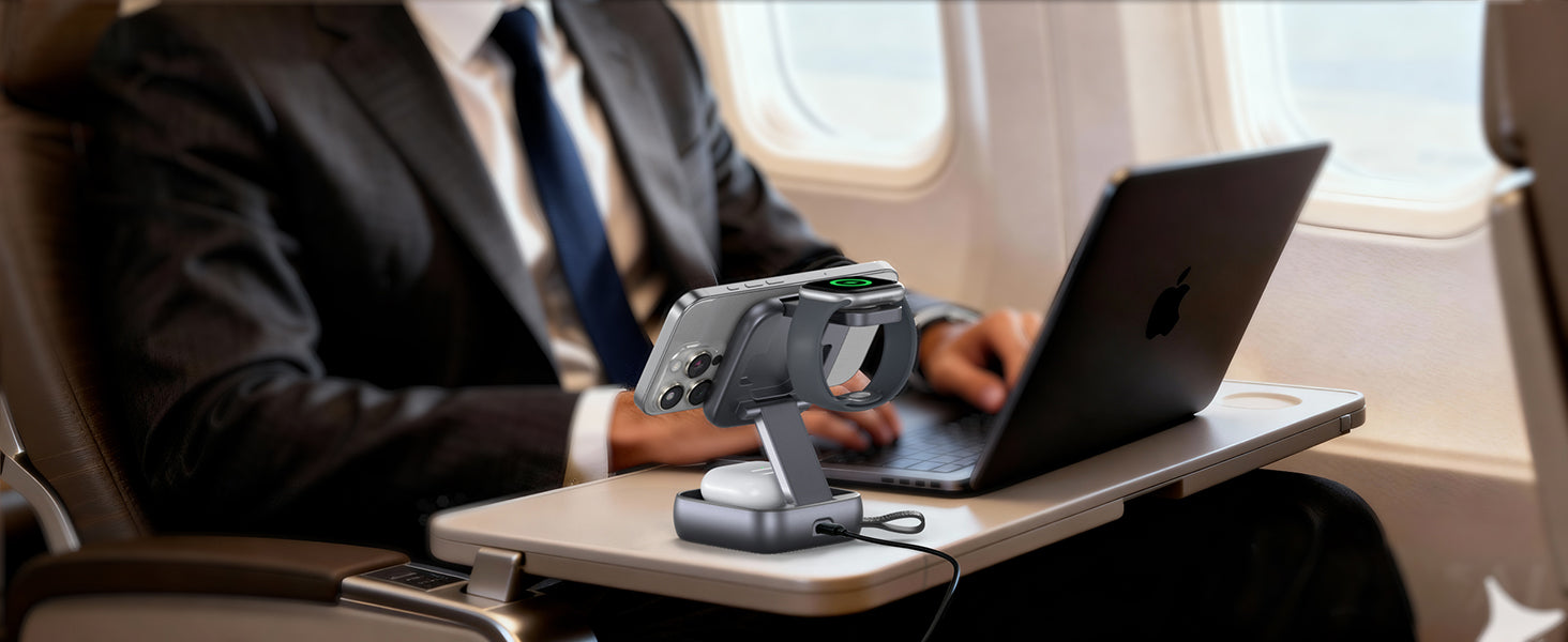 For the best experience, use the included 20W USB-C adapter. Place your iPhone within the MagSafe alignment zone for fastest charging, rest your Apple Watch on its dedicated cradle, and drop AirPods with a wireless charging case onto the base. Keep the dock on a stable, flat surface to take advantage of the anti-slip base and one‑hand removal. If you’re traveling, fold the unit flat and use the strap to secure it in your bag.