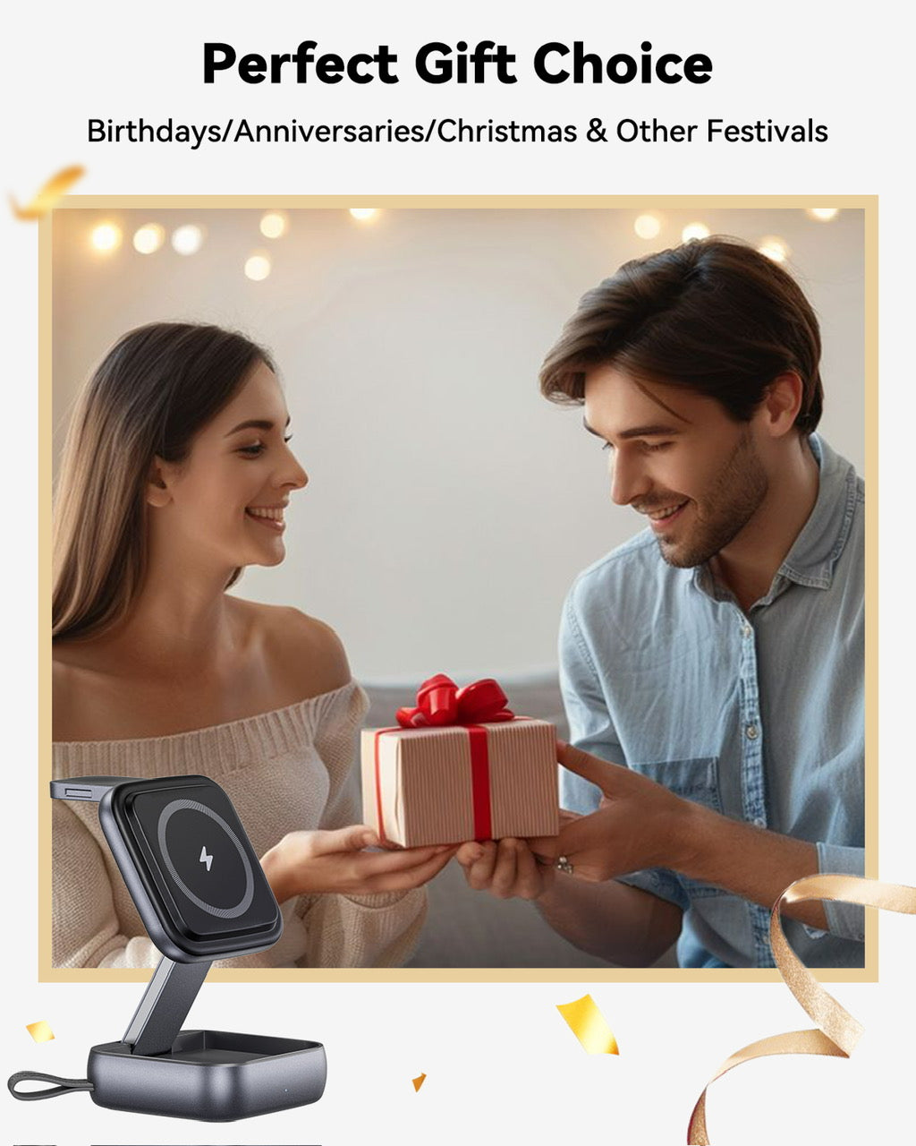 APPLE-CERTIFIED COMPATIBILITY – Designed for iPhone (all Qi devices), Apple Watch Series 1–9/SE, and AirPods with wireless charging cases.